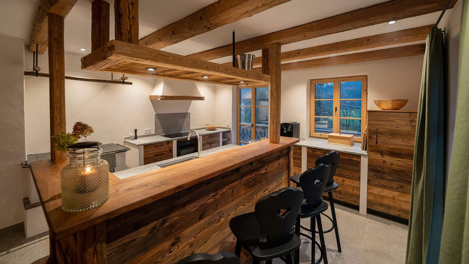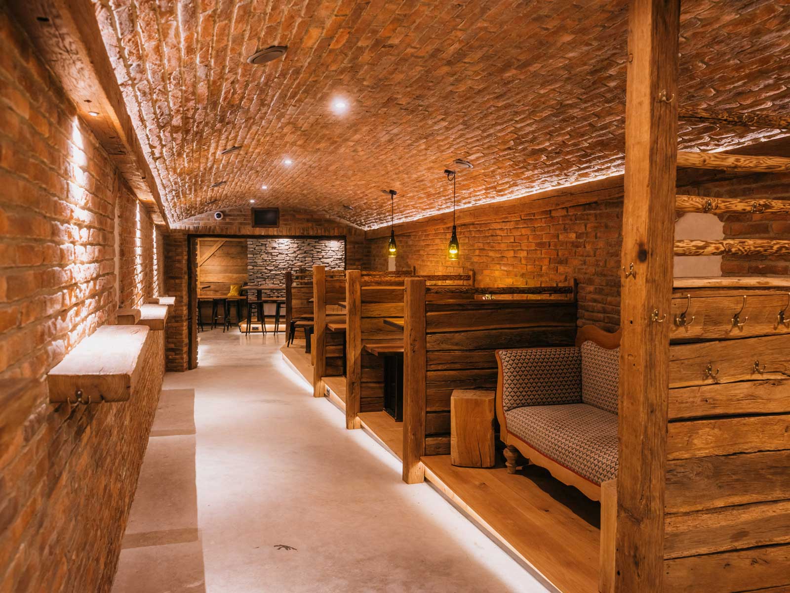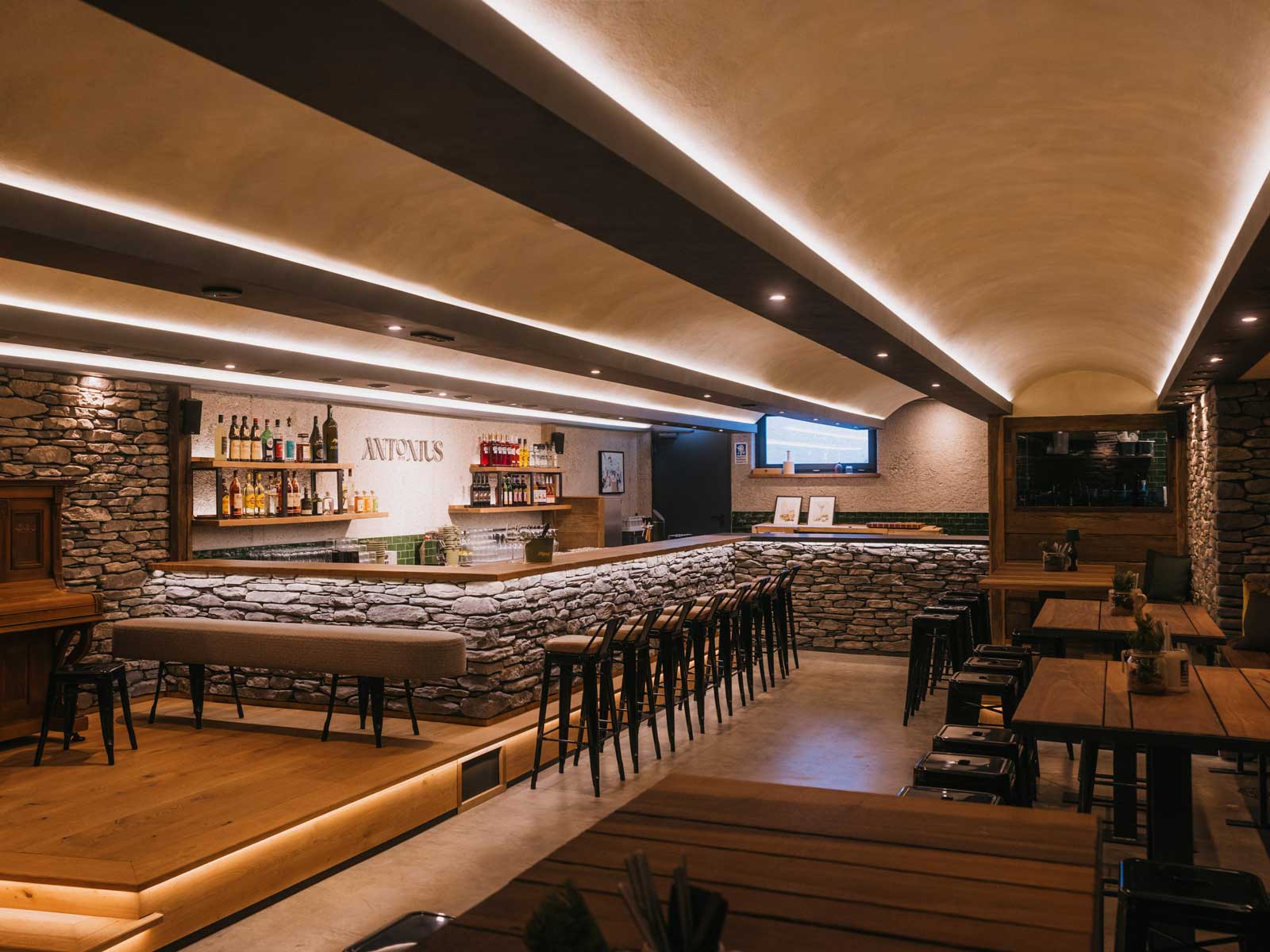 Sichtbare Holz- und Steinelemente, maßgefertigte Details und eine stimmungsvolle Gestaltung verleihen der Bar ihre einzigartige Atmosphäre.